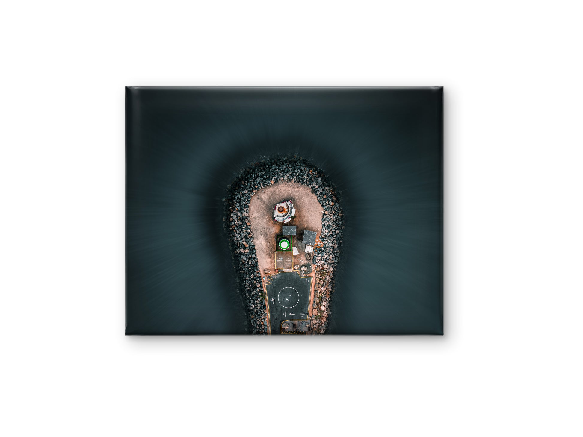 The soft motion in the surrounding sea creates a dreamlike rhythm, guiding the eye toward the vivid geometry of the mole and lighthouse. It’s a view few ever see — where human design meets the raw edge of the ocean.