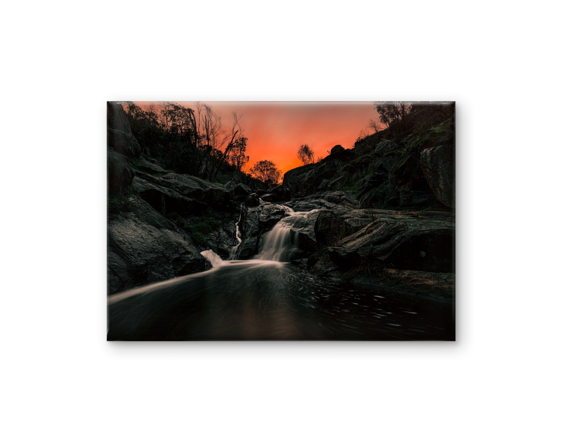Shot in the Perth Hills, this image brings together rugged textures and serene light, evoking a sense of calm and renewal. The interplay between water, rock, and flame-toned sky turns the scene into something both intimate and dramatic.
